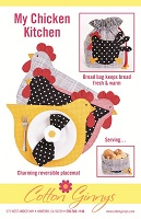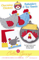These sweet potholders and tea towels are fun and easy to make. Add border fabrics to readymade tea towels to coordinate with potholders. Tuck a tea towel inside the round potholder to make a unique gift. Round potholder is 9” and the chicken potholder is 6-3/4” h x 9-1/4” w.